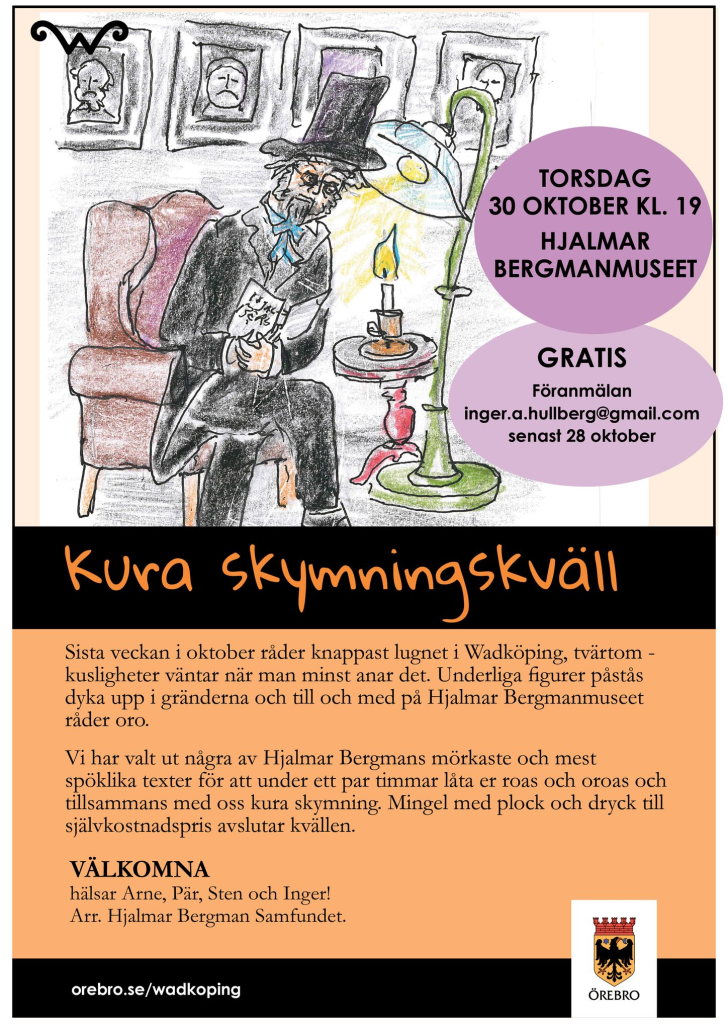 Den 1 november 2024 i Hjalmar Bergman Museet i Wadköping. Bus eller godis. En kuslig högläsningskväll lockade ut många till Hjalmar Bergman museet i Wadköping på själva Allhelgonaafton. Då läste Pär Bäckman, Sten Wistrand, Arne Johnsson och Inger Hullberg högt Hjalmar Bergmans noveller Judith, Vid gränsen, Brandvakt och Siste kavaljeren.